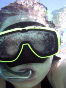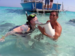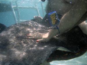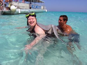 The larger stingrays are the females and they are about three times the size of the males. One thought my camera was food and nibbled my fingers as it tried to taste the camera. I learned that if I stood still in the waist-deep water and extended my arms in front, the rays would swim right up to me and I could rub its belly. After touching several and getting my photo taken with one, I donned my snorkel and was content to just watch the rays swim under the water. The snorkel mask also protected my eyes…the salt water had been stinging them. I even got the hang of it so that no water would go down my tube. I was able to get lots of pictures of the rays (and some human legs). I even saw a parrot fish and snapped its picture. I have to say, my $60 underwater digital camera isn’t doing too bad for a cheapy.