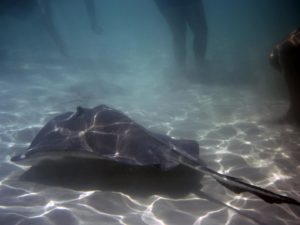 took us to the bus that was taking us to our boat. Once on the boat, it was another 30 minute ride to where the stingrays were. The rather large, but gentle creatures are very curious and come right up to check you out. They aren’t scary and you don’t have to worry about their barb…they’re not going to use it unless they are really threatened since they only have one and would be defenseless once they use it. Our guide heard through the grapevine that Steven Irwin was trying to ride one and was too rough with it.