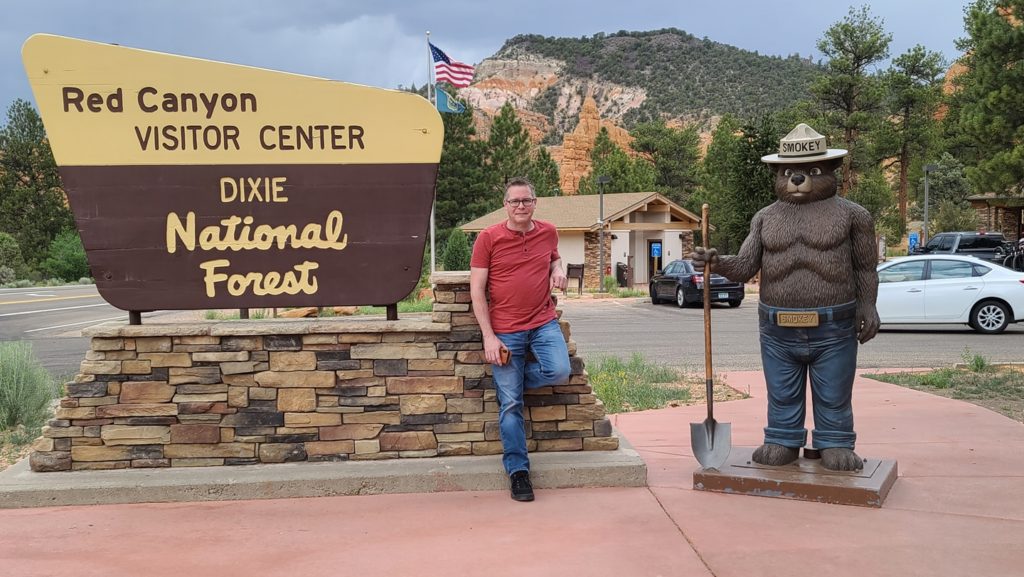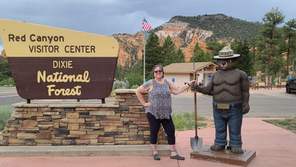 Driving north, we came upon the Red Canyon Visitor Center that is part of the Dixie National Forest. I even got to take a picture with Smokey Bear!