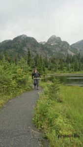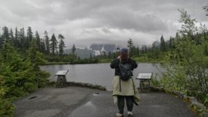 It was a disappointing day, waking up to drizzle that turned into down pours, high winds, and low temps in the mid-30s on our first full day at Mount Baker/Heather Meadows. I had been here numerous times, but with bad knees, so I couldn’t hike. My friend hadn’t been here at all and I was sad that she couldn’t even see Mount Baker for the pea soup fog at Artist Point.