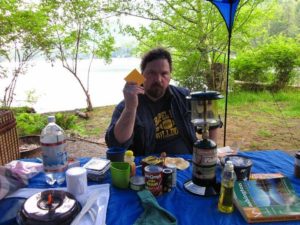 We set up camp quickly and just finished when it got dark and a lantern had to be lit. William attempted to start a campfire while I made dinner of sausages and potato salad. No luck with the campfire since we had no starter log or kindling.