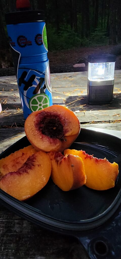 We reached Union Creek with just 40 minutes of daylight to spare. Tents up, dinner down, and then—out of nowhere—a young man named Taylor appeared beside our picnic table. He offered us peaches from his tree back home, shared stories of growing up in the area, and gave us each a warm hug before disappearing into the night. A hugger, like me. Instant camp magic.