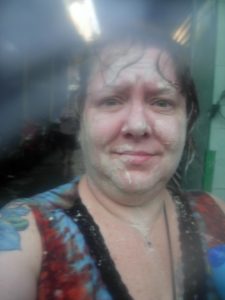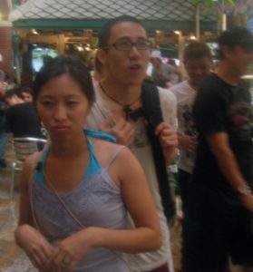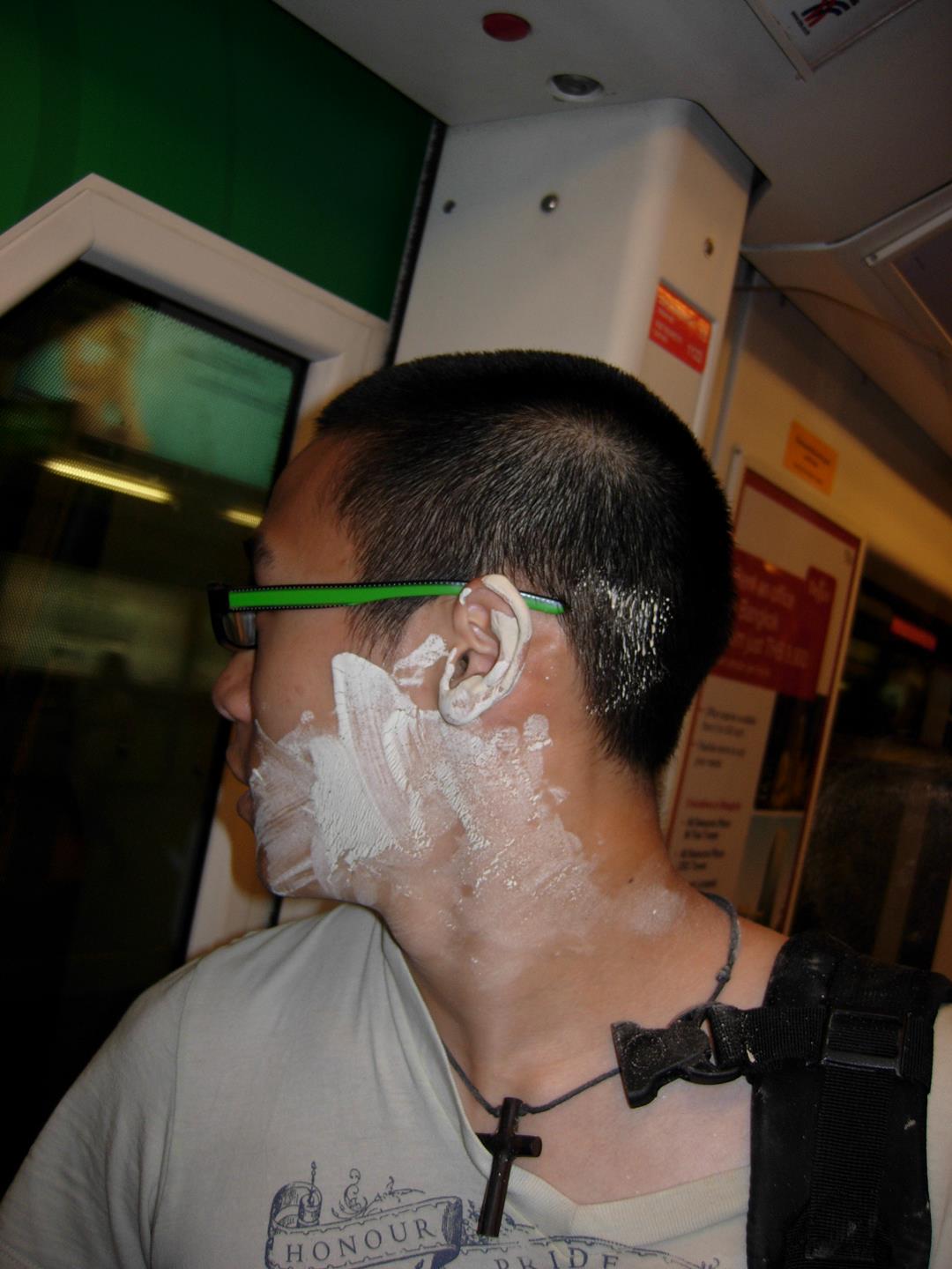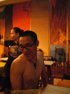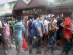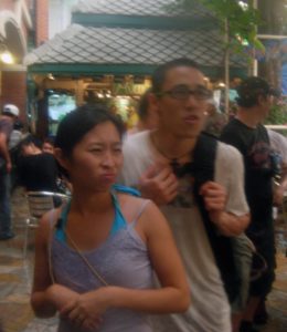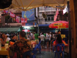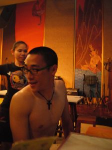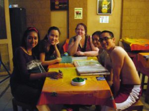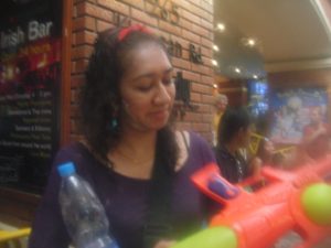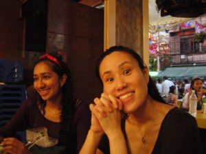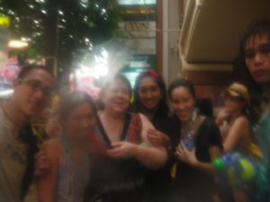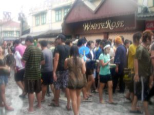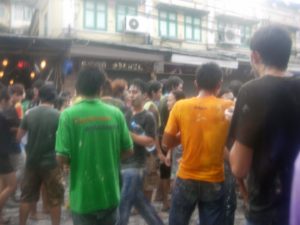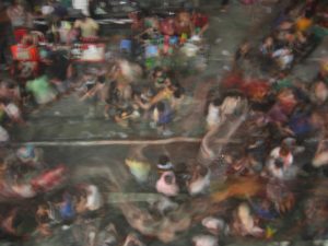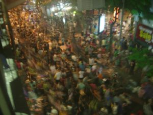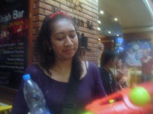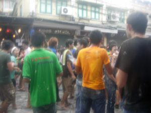 After a couple of hours nap, I took a tuk tuk to Khao San Rd. to meet up with friends. The protesting is pretty much over and everyone was out in the streets to celebrate the last day of the Songkran Festival. While riding the tuk tuk, I got drenched many times when we were stopped at lights. Once we got close to Khao San Road, I had to walk in since the tuk tuk couldn’t get through (too many people). I was trying to find the Brick Bard, but ended up walking down the wrong direction of the road. I was sprayed with lots of water and my face was covered with clay which people would rub on everyone. I finally figured out I was going the wrong direction and found the Brick Bar. It was closed, so I sent a text to Layla to see where they were. Meanwhile, I got a quick bite to eat at McDonalds. I had left my hotel around 5:30 and it was already 7pm. Layla & Gloria found me and we gathered up Franklin and Anna and went to look for a place to sit, eat, and talk. We found a nice dry place. I got myself a cappuccino, which was pretty good, so I had another. We talked, took pictures…talked some more. It was really nice. When we left, Layla and Gloria went to look for a hostel. Franklin and Anna were staying at a hotel close to me, so we decided to get a taxi together. We couldn’t get that close since the streets were blocked off with people dancing, splashing water, and having lots of fun. We hopped on the skytrain just to try and bypass the mobs of people. Then we had to walk a couple of blocks to get to Silom Road. Once there, I was familiar with my surroundings and all was good. Now that I’m back at the hotel, I’m looking in the mirror and see that I have clay all over my face and hair. Time for a shower.