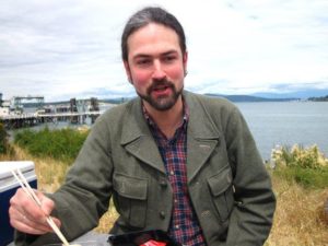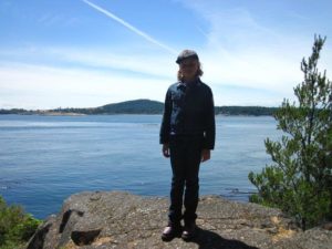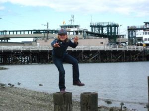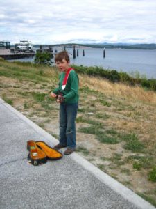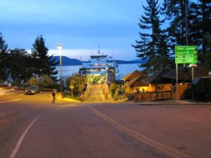 Done playing for the evening, we walked back to our camp site. Jherek was choppping kindling for our evening fire and we were discussing when to leave the next day. We originally thought to catch the 1045am ferry back to Anacortes. I mentioned that there was one at 7:50 and there were noises of catching that one (which meant getting up around 6am). Right before Jherek was going to light the fire, I blurted out, why would we spend another miserable night on hard beds and being cold if were weren’t doing anyting else on the island before leaving the next morning (and it being so early). I said that the last ferry of the night was at 11:20pml and who would be up for just packing up and catching that one. Everyone, but Eleanor, was very enthusiastic about that suggestion. So, we packed up our cars and headed to the ferry dock, where we were third in line, in spite of it being a 2 1/2 hour wait. We fouind chairs at the closed coffee shop and the guys & Eleanor read more comedia d’arte.
