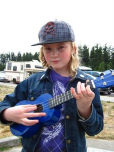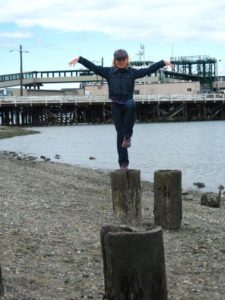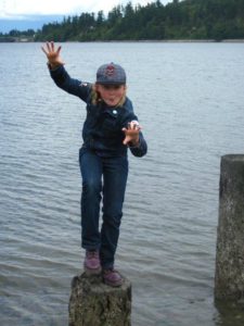 With dinner finished, Anne washed the dishes, Jherek dried, and put away. Then, we headed over to the playground by the restrooms to play bocce (lawn bowling). It was really fun and some kids stopped to watch. I heard one father explain how the game was played to the kids. While retrieving my balls after one game, I saw something green jumping in the grass. At first I thought it was a green grasshopper, but was puzzled because we don’t have grasshoppers in western WA. Looking closer, I saw it was a tiny, green tree frog. I quickly caught it, then asked the kids who wanted to hold a frog. Their dad made them line up and take turns. They thought it was so cool and their dad was telling them about that type of frog. Eleanor went over and was last to hold it, then returned the frog back to the forest where it belonged.