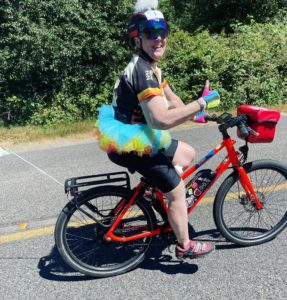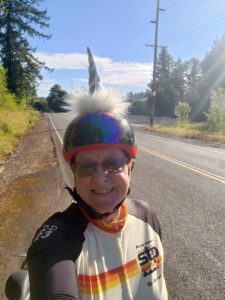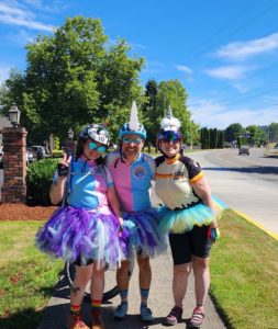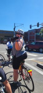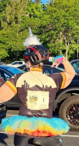 Billy took some photos of me after I donned my tutu and helmet with the unicorn horn. I was wearing the costume to help support the Trevor Project since I have a grandchild who is trans-gendered. I also wanted to ride in solidarity with my friend, Benjamin, who lost a trans child to suicide last year.