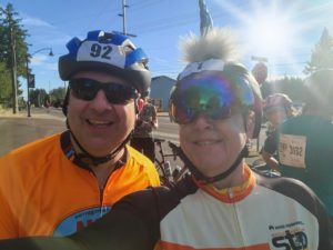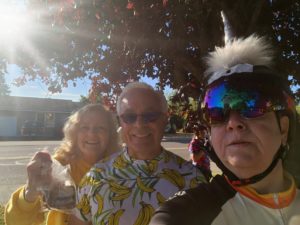 One of the first stops was in Napavine after a long, steep hill. Susan and Gene were there handing out home-made banana bread as they have been doing for over 30 years! Gene was wearing his banana print shirt and Susan had on banana yellow. The Top Banana award was designed and handed out in their honor.